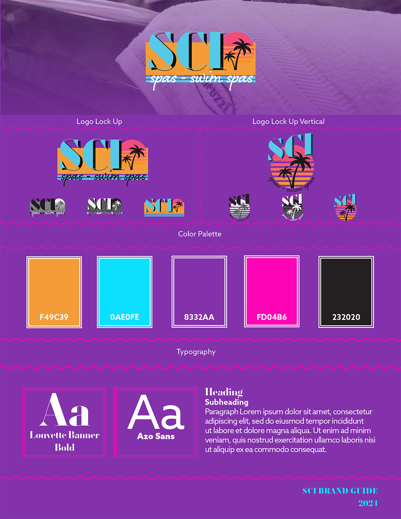 The logo design and branding for SCI Spas – Swim Spas was based on the client’s desired color palette, which was inspired by neon colors commonly associated with Miami aesthetics. Using this as the conceptual foundation, the logo design drew inspiration from iconic visuals found in media such as Miami Vice and other 1980s Miami-inspired design styles. The final design incorporates the color palette in a way that reinforces the intended visual aesthetic while maintaining a clean and versatile logo suitable for a variety of applications.